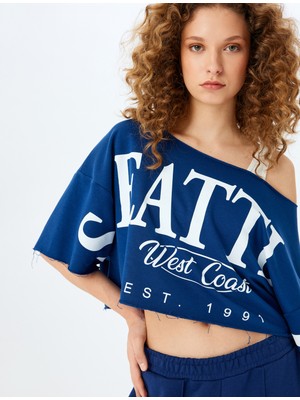 Koton Asimetrik Yaka Kolej Baskılı Oversize Kısa Kollu Crop Tişört