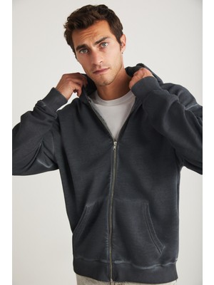 Grimelange Hendrıck Erkek Kapüşonlu Içi Polarlı Yan Cepli Fermuarlı Yıkamalı Koyu Gri Sweatshirt