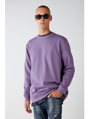 Grimelange BLANDON Erkek Bisiklet Yaka İçi Polarlı Baskı Detaylı Yıkamalı Lila Sweatshirt